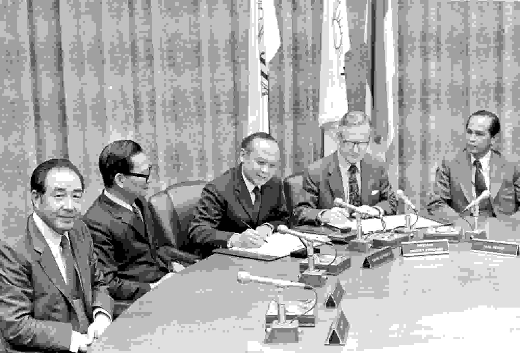 Among those present at the signing are Abdul Habir, Charge d'Affaires, Embassy of Indonesia (center) and Country Programs Director, Asia Region, Raymond J. Goodman (second from right; 1724225; Credit: The World Bank).
